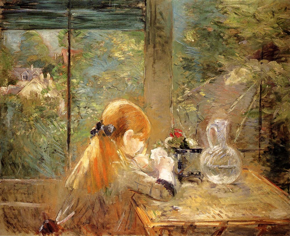 Work Red Haired Girl Sitting on a Veranda Painted in 1884 More Details Roses Tremieres The Garden at Bougival Young Woman in Mauve Reading You can see more of Berthe Morisot’s work on WikiArt.